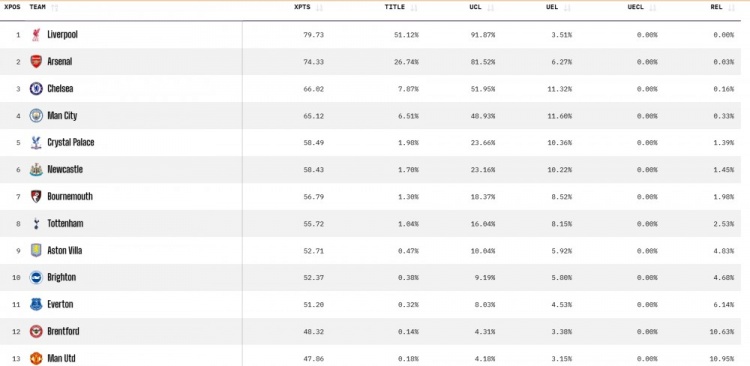 9月15日讯 OPTA预测了英超球队的赛季最终排名以及欧战资格情况,最终认为利物浦是冠军最大热门,并且还认为曼联比起取得欧战资格,要更加接近降级。以下是OPTA对英超BIG6的最终排名以及赛季成绩的概率预测。