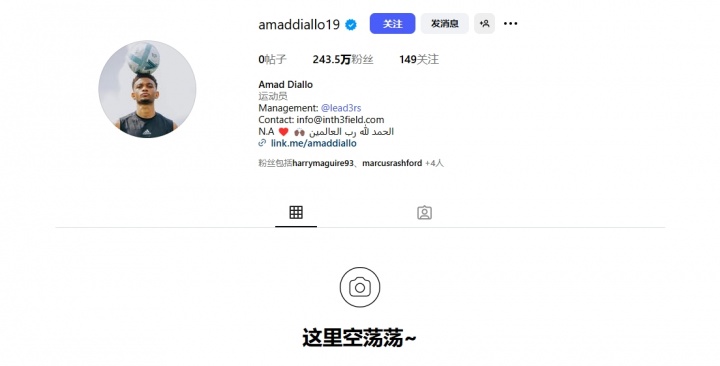 09月21日讯 英超第5轮焦点战,曼联主场2-1战胜切尔西,赛后阿玛德与今夏从曼联转会至切尔西的加纳乔交换球衣,并将合影发在社媒上,今日阿玛德却清空了社媒的所有动态。